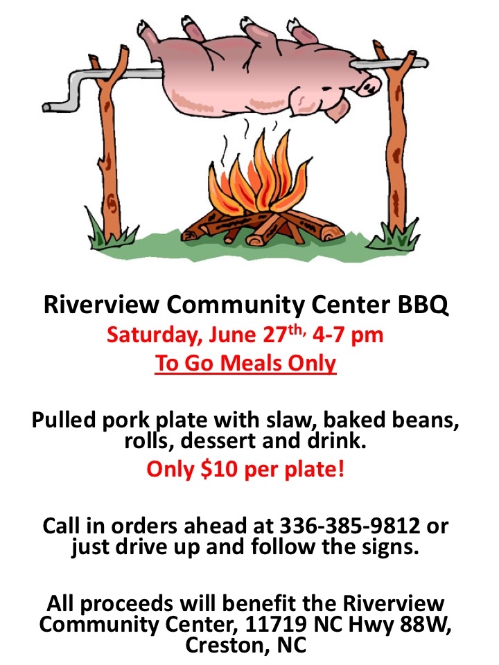 The Riverview Community Center will host a BBQ on Saturday. This will be “To Go” meals only. Plates will consist of Pulled pork, slaw, baked beans, rolls, dessert and a drink for only $10 per plate! Call in orders ahead at 336-385-9812 or just drive up and follow the signs and the smell! All proceeds will benefit the Riverview Community Center, 11719 NC Hwy 88W, Creston, NC. We appreciate your support! Contact David Ahrens if you have questions at 336-977-1144.